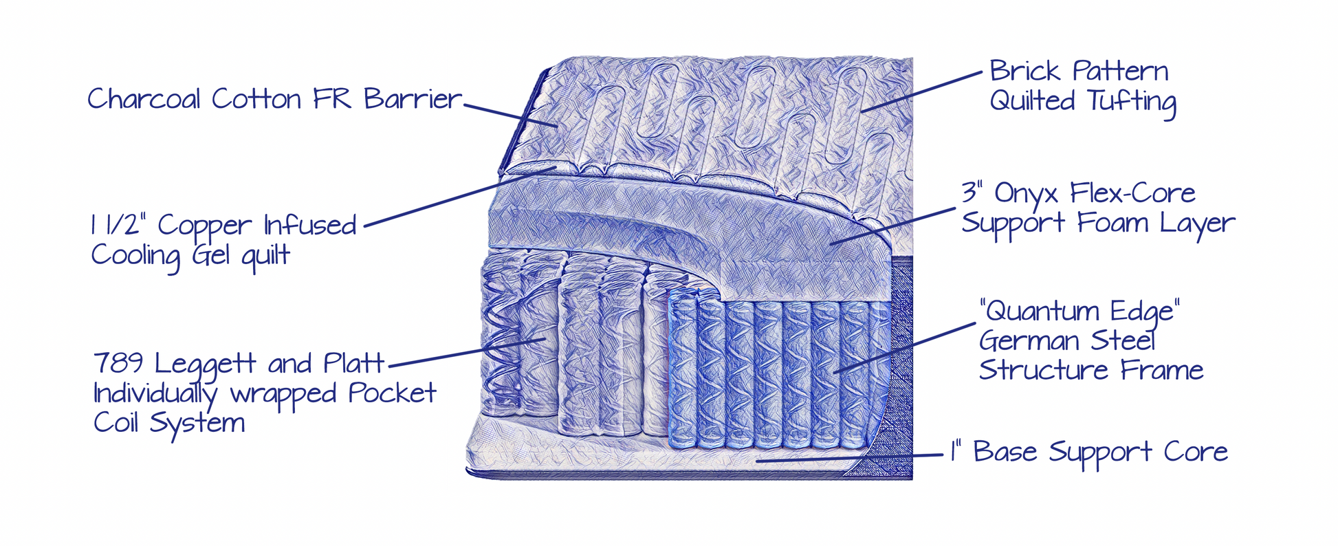 OnyxLux is our luxury firm option that features our Copper and Gel Infused foams with proprietary advanced supportive air technology, which includes billions of microscopic air capsules that promote airflow, enhance breathability, and increases support without compromising comfort. The foams are combined with a 789 Quantum Edge (Queen Count) Wrapped Coil System to provide increased edge support and increase the overall size of your sleeping surface. The individually wrapped coils contour to your body to reduce partner motion transfer disturbances and eliminate noise.